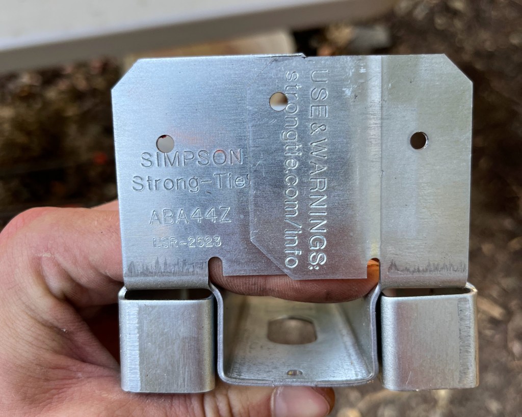 Once the forms are filled with concrete, you need to attach an anchor bolt to the concrete pier to fasten a metal post brace (see pictures below). Make sure you select an anchor bolt that fits the metal bracket. This metal post base holds the 4” x 8” x 12’ beam that the cabin rests on. The metal also keeps the untreated wood off of the concrete.