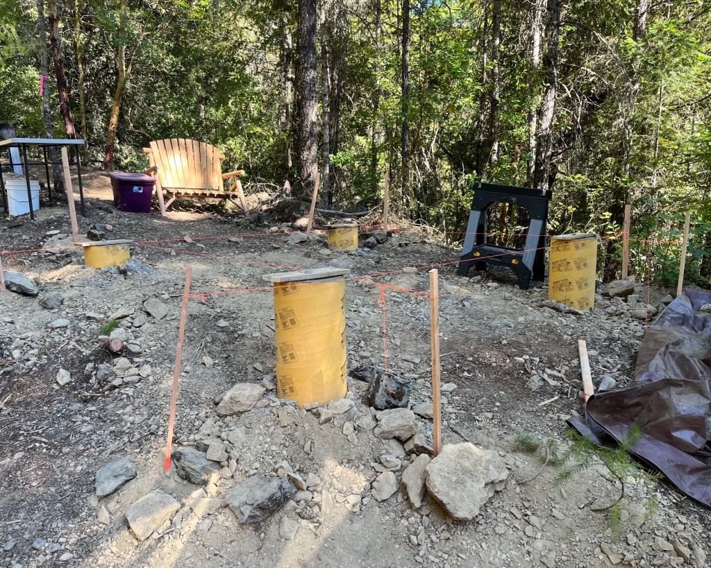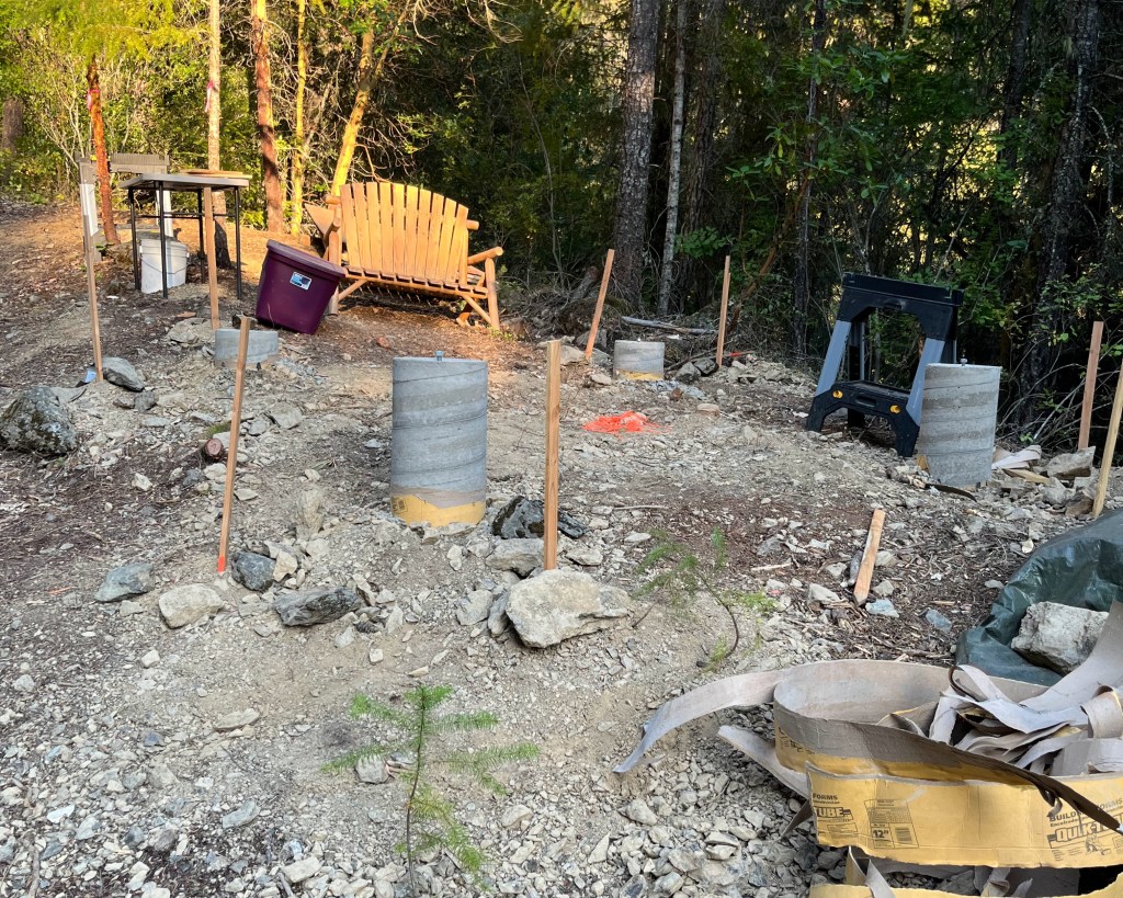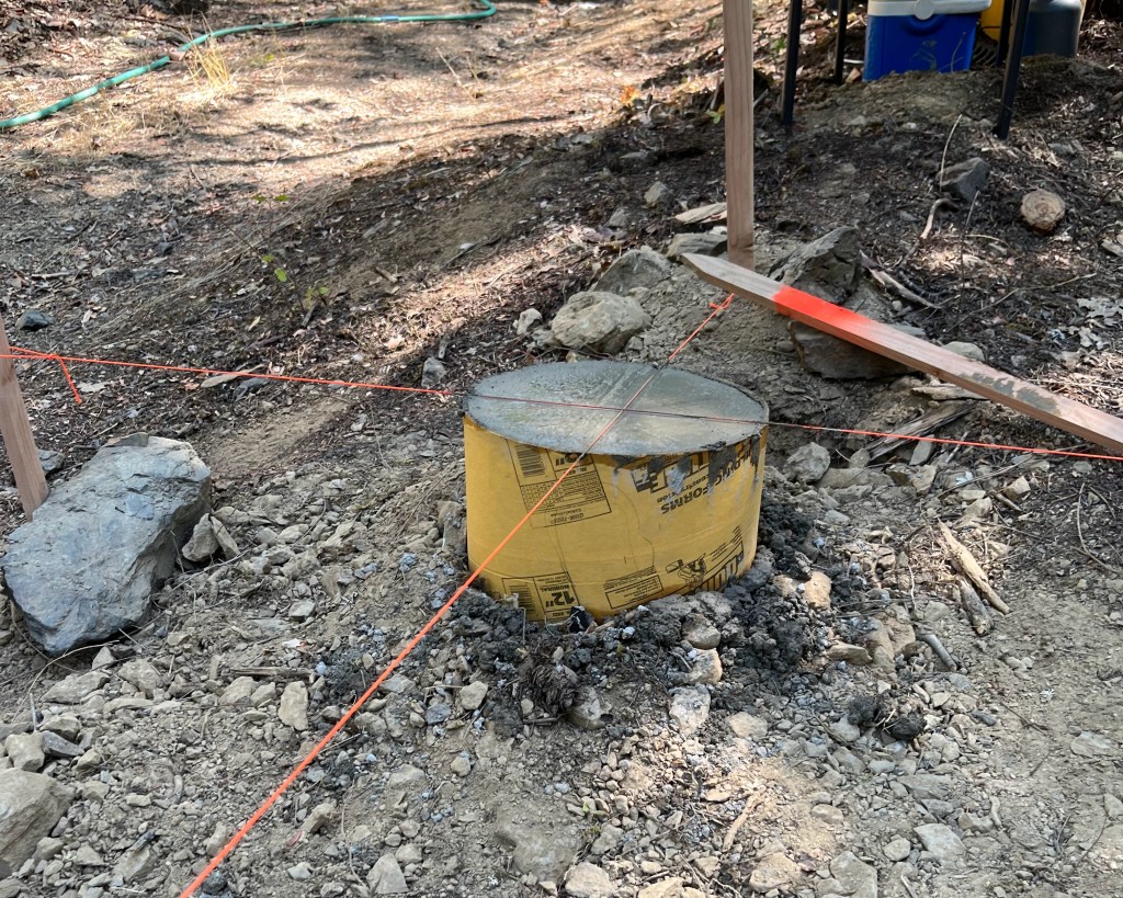 In this post, I will go over pouring the pier foundation for a 12’ x 12’ cabin. If you haven’t read Part 1 on how to layout this foundation check it out first. We used Quikrete 5000 concrete for our foundation. This commercial grade high early strength mix is targeted for projects thicker than 2 inches. One 80lb bag of concrete yields 0.60 ft3 of finished concrete. Foundations will vary in size based on the site on which they are built. Use online volume calculators to determine how many bags of concrete you need, then buy more than you need. It is better to have more concrete than to start pouring and run out of concrete.
