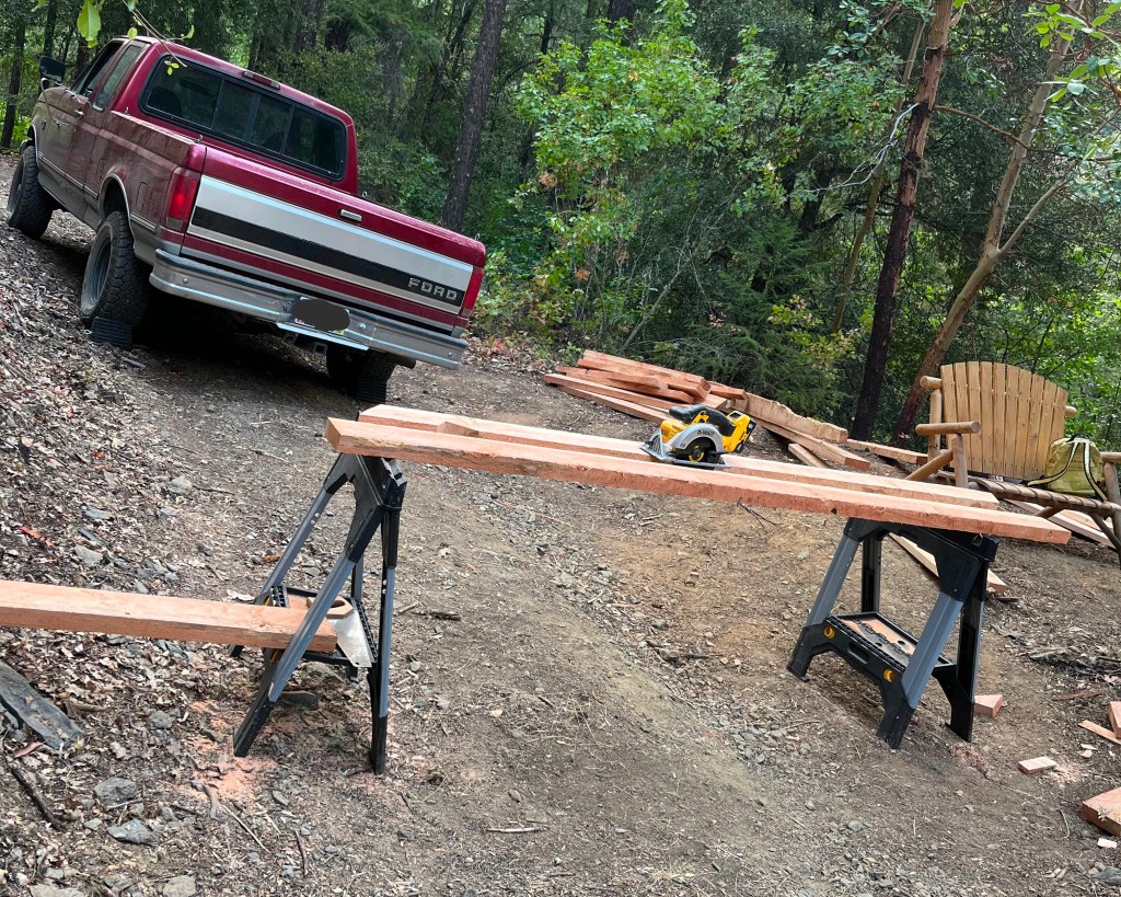 - Dewalt Saw Horses: A buddy of mine who was moving away gave me this set of sawhorses. They are pretty sturdy and allow for an adjustable height. Any pair of sawhorses will do.