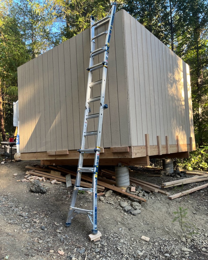 - Adjustable Ladder: This was the main ladder we used for the 12’ x 12’ cabin project. I liked this ladder as it worked as an A-Frame ladder, and an extension ladder. When shopping for a ladder, I required it to expand far enough to reach the top of the roof on the gable ends of our cabin. This ladder fit the bill.