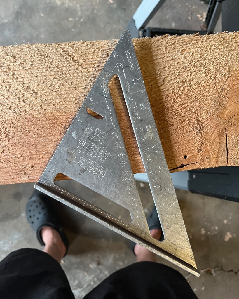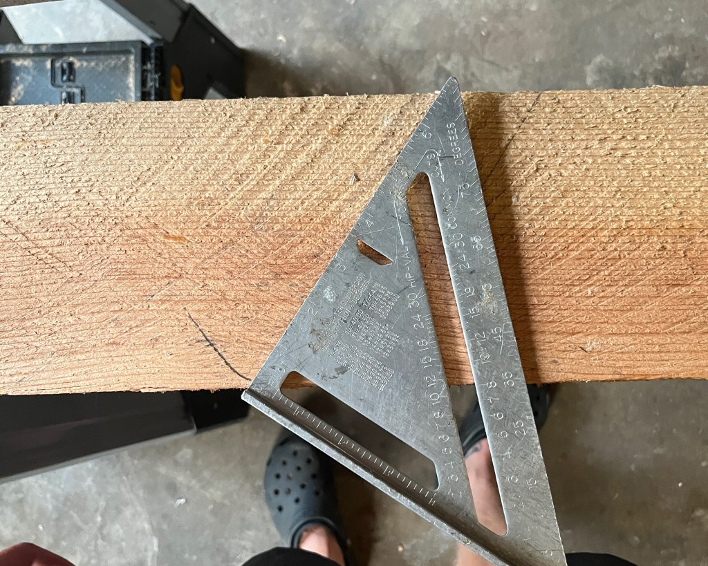 7. Measure down to your desired overhang, and mark and cut the rafter the same way as the top cut.