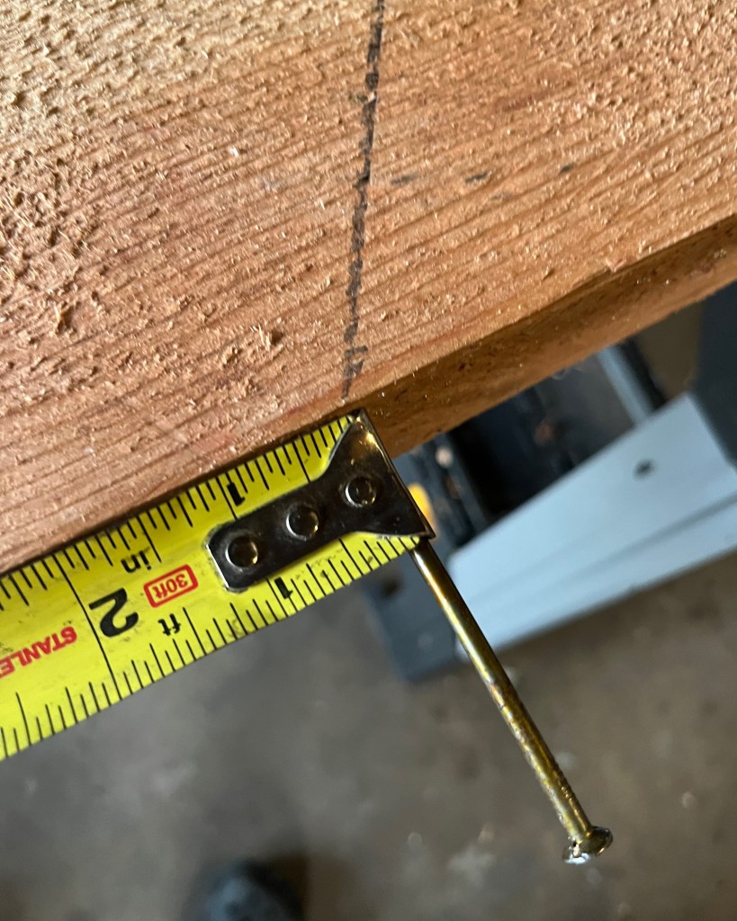 4. Measure where the bird’s mouth of the rafter will start (closest to the overhang). You can get this dimension using the Pythagorean theorem or referencing a set of plans. Pull from the bottom of the rafter, using a temporary nail can give your tape measure something to hang off.