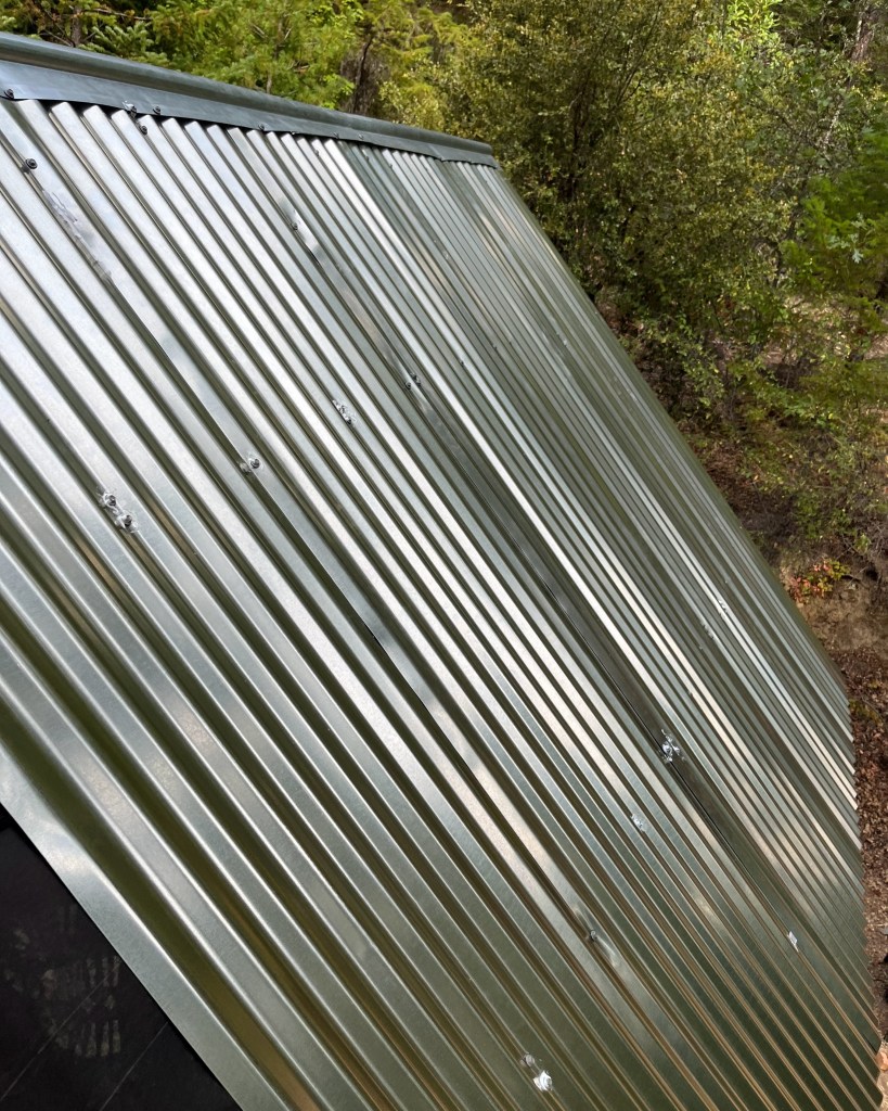 17. Add on your ridge cap and screw it in. We initially used a premade ridge cap from where we got our roof panels. It ended up not overlapping enough and, frankly just did not look good. Instead, we folded a piece of metal roof hot-dog style and used it instead. It looks and functions much better.